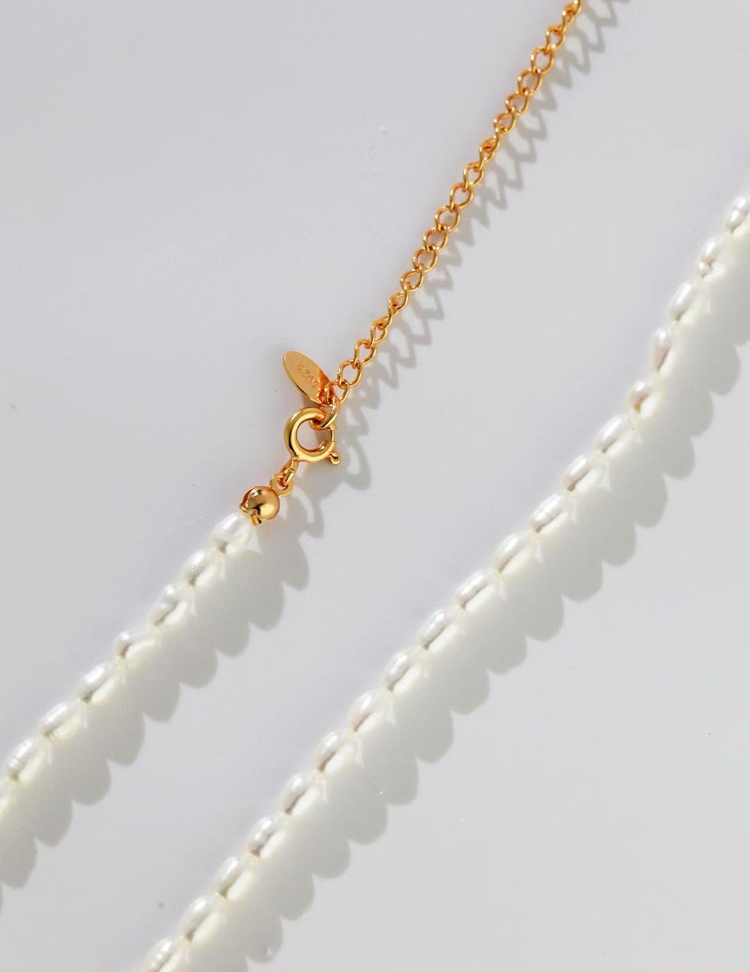 Crafted from 925 sterling silver and adorned with natural freshwater pearls, this elegant piece exudes timeless sophistication. Featuring a retro gold finish, the necklace measures 34cm with a 6cm extender for adjustable comfort. Each pearl is approximately 3–3.5mm in size, offering a delicate texture perfect for layering or solo styling.