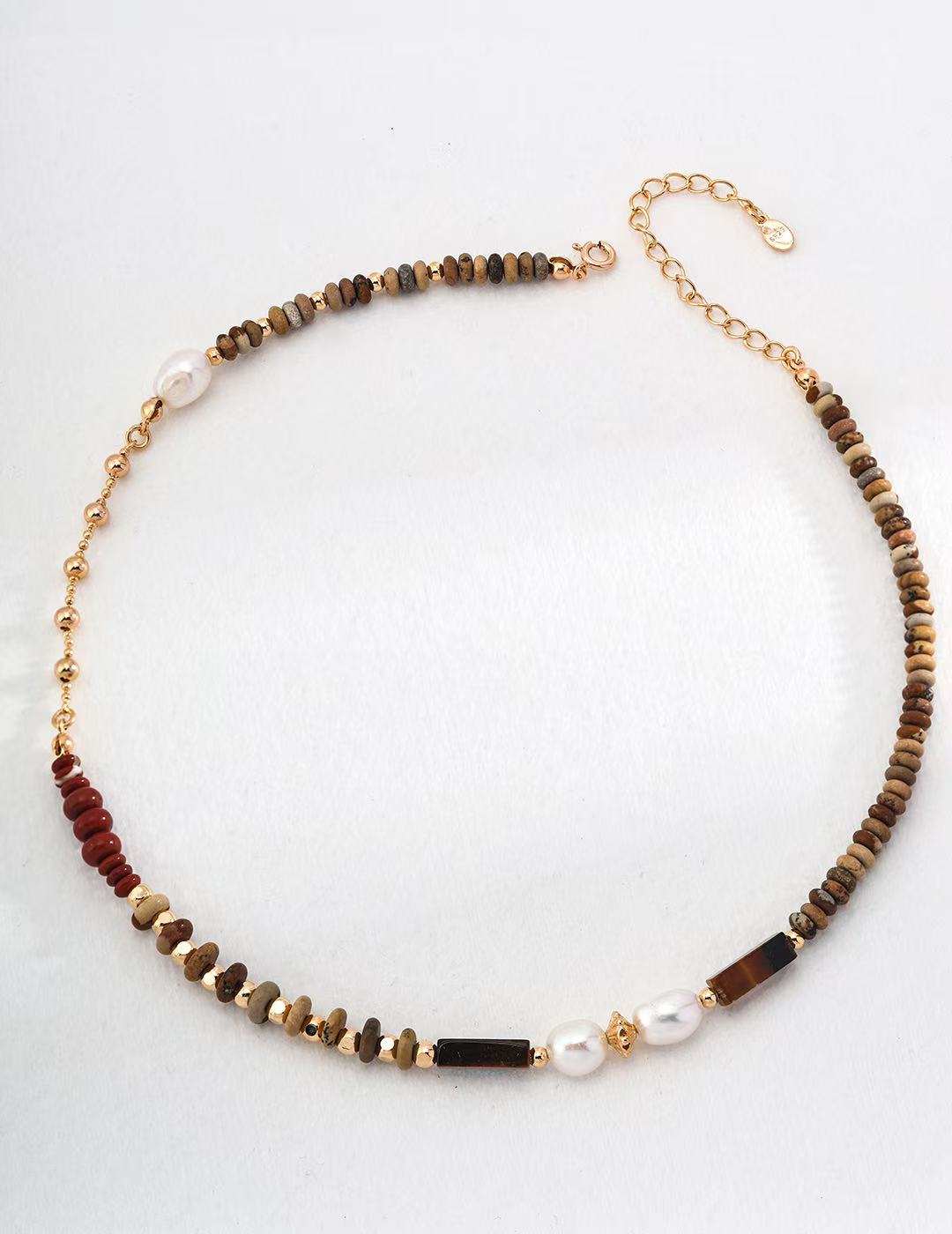 Elevate your everyday look with this handcrafted necklace featuring a rich mix of textures and tones. Made with genuine 925 sterling silver, natural freshwater pearls, picture jasper, red stone, and tiger eye, this piece blends earthy elements with timeless elegance. The vintage gold-toned chain and asymmetrical layout add a unique artistic flair, making it perfect for layering or standalone styling.